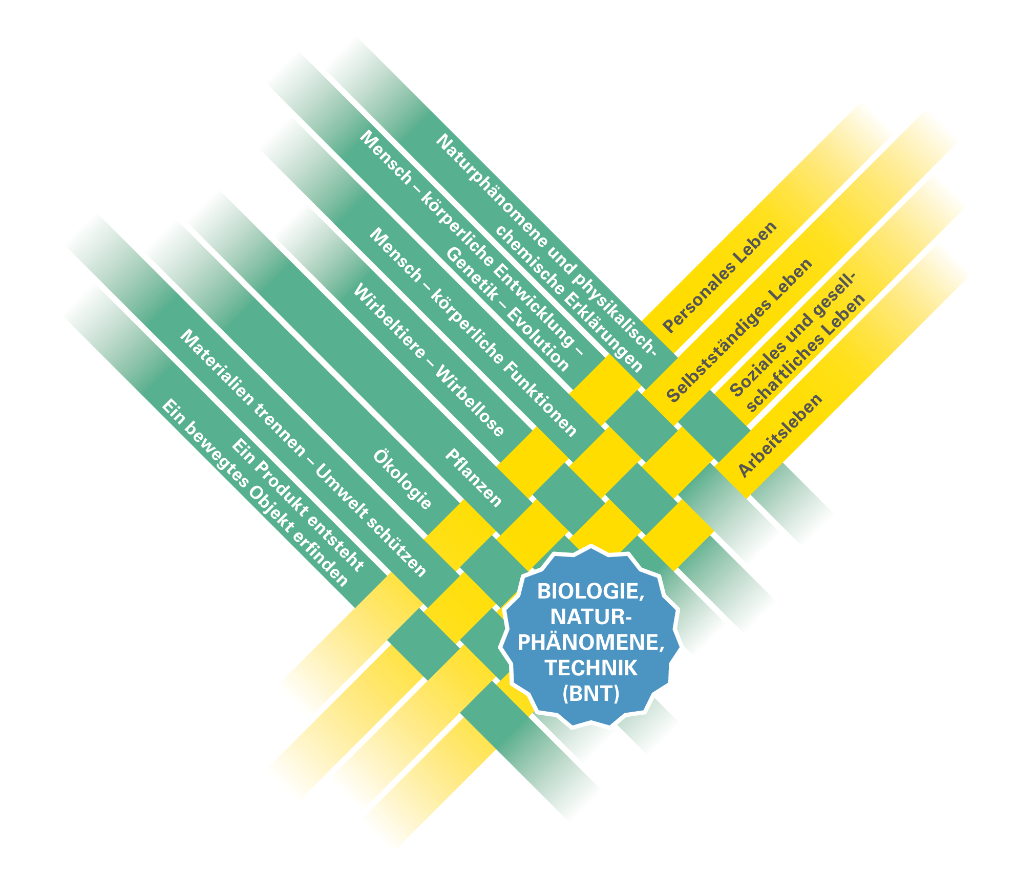 Die prozess- und inhaltsbezogenen Kompetenzen naturwissenschaftlicher und technischer Bildung gliedern sich in die Kompetenzfelder der Fächergruppe Biologie, Naturphänomene und Technik (BNT), die Kompetenzfelder des Faches Technik und die Kompetenzfelder des Sachunterrichts Naturphänomene und Technik sowie Natur und Leben und sind im Zusammenhang zu verstehen. Hierbei wurde auch die Altersentsprechung von Kompetenzen und Inhalten berücksichtigt. Entsprechende Verknüpfungen finden sich in den jeweiligen Kompetenzfeldern. Weiterführende Inhalte und Kompetenzen finden sich unter den Verweisen auf die betreffenden Bildungspläne der allgemeinen Schulen.