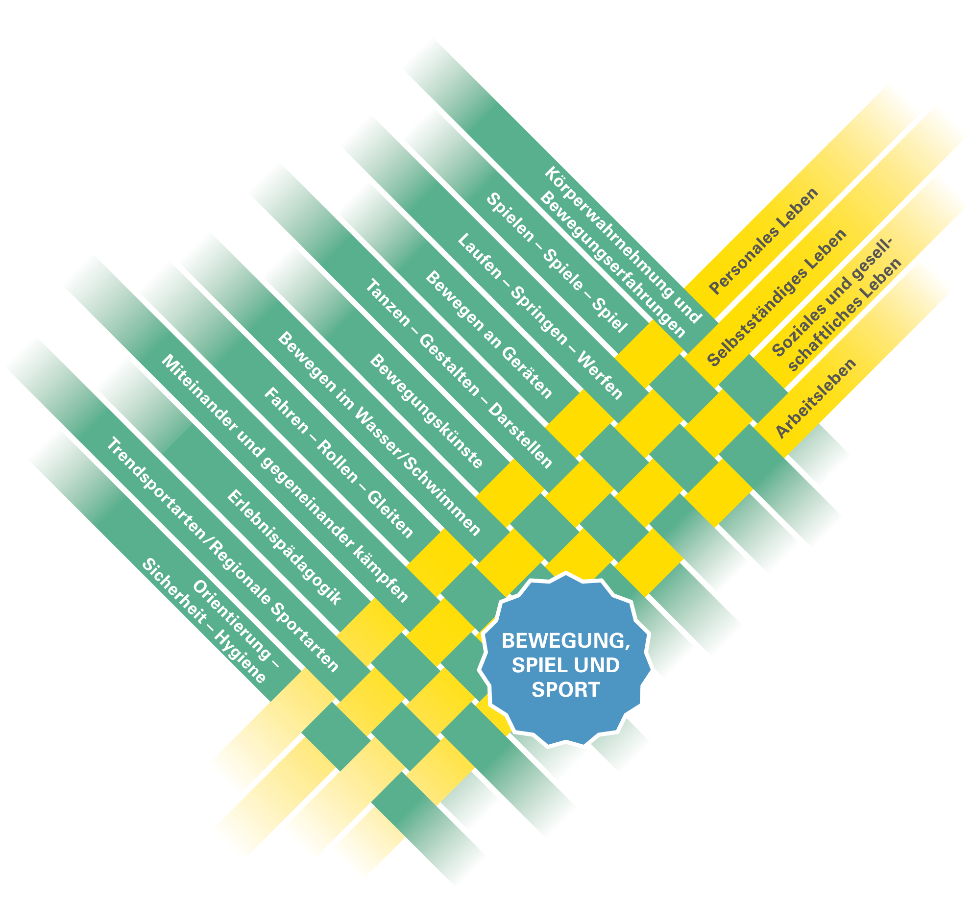 Das Fach Bewegung, Spiel und Sport ist eng verknüpft mit den Lebensfeldern. Schnittpunkte ergeben sich vor allem mit den Lebensfeldern „Personales Leben“, „Soziales und gesellschaftliches Leben“ und „Selbstständiges Leben“.