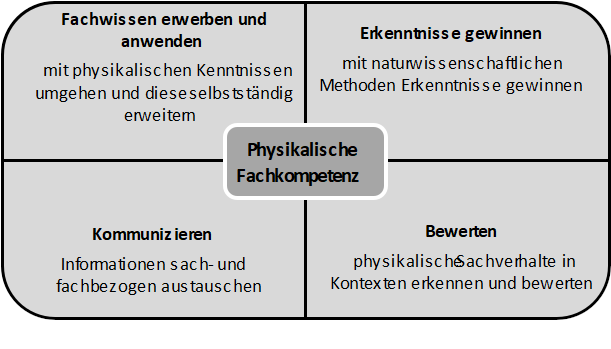 Die Bildungsstandards der KMK definieren bezüglich der physikalischen Fachkompetenz vier Fachkompetenzbereiche, die – wie auch in den anderen Naturwissenschaften – eine Inhaltsdimension und eine Handlungsdimension umfassen. Die Inhaltsdimension wird überwiegend im Kompetenzbereich Fachwissen, die Handlungsdimension in den Kompetenzbereichen Erkenntnisgewinnung, Kommunikation und Bewertung dargestellt. Inhalts- und handlungsbezogene Kompetenzen greifen ineinander und werden in der Regel gemeinsam erworben. Durch das Zusammenwirken der vier Fachkompetenzbereiche entwickelt sich die physikalische Fachkompetenz.