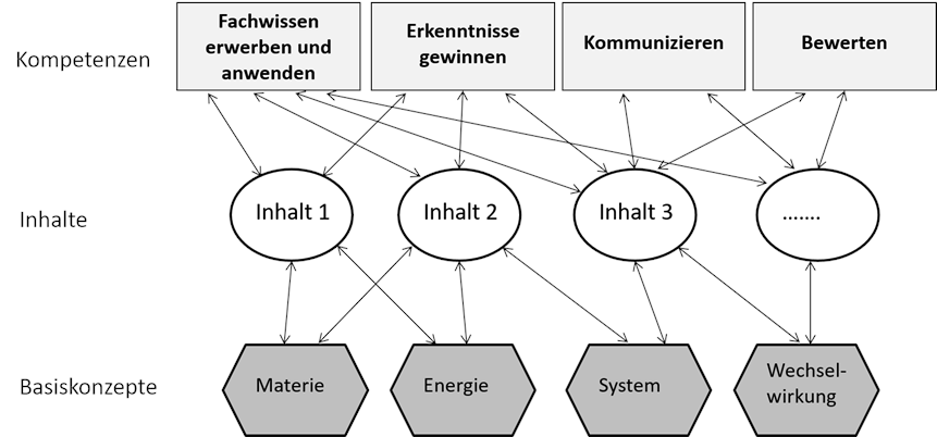 Die Wechselbeziehungen zwischen Kompetenzen, Inhalten und Basiskonzepten gehen aus der folgenden Abbildung hervor: