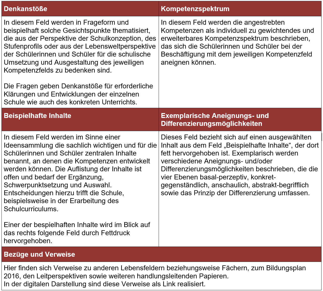 Die Lebensfelder (Teil B) und Fächer (Teil C) folgen immer einem gleichen Aufbau: In den vorangestellten Leitgedanken (jeweils Kapitel 1) werden der Bildungsgehalt, die Kompetenzen sowie didaktische Hinweise des jeweiligen Lebensfeldes beziehungsweise Faches erläutert.