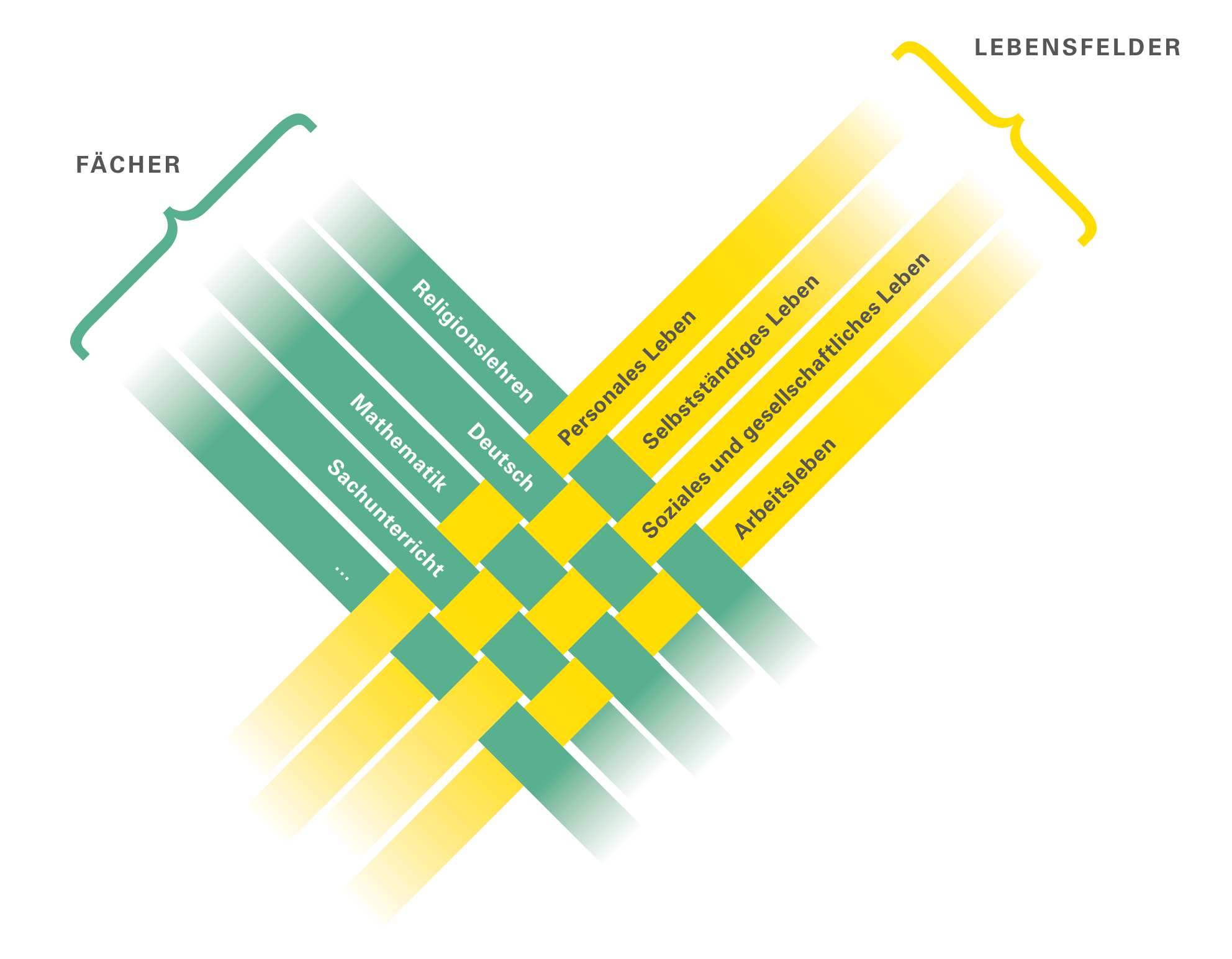 Damit ist es Aufgabe der Schule, der Lehrkräfte und der multiprofessionellen Teams, den Unterricht und das Schulleben so zu gestalten, dass die Kompetenzen erworben werden können, wie sie in den Kompetenzfeldern mit der Verflechtung der Lebensfelder und Fächer verdeutlicht werden. Inhaltsbezogene und prozessbezogene Kompetenzen aus unterschiedlichen Unterrichtsfächern werden in Kombination mit überfachlichen Kompetenzen, die den Lebensfeldern zugeordnet sind, handlungsorientiert und ganzheitlich angewandt, reflektiert und ausgebaut.