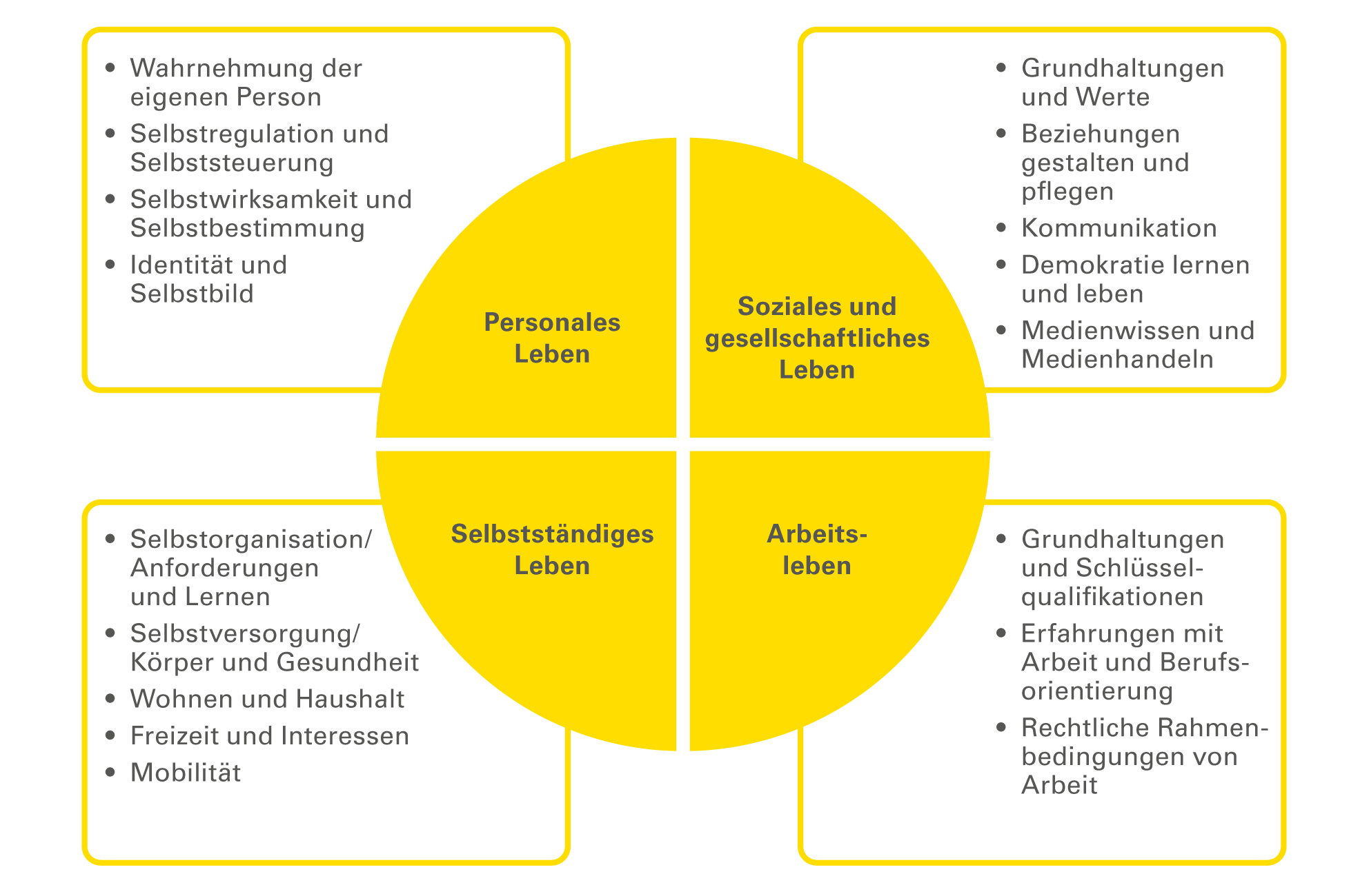 Der Übergang ins nachschulische Leben wird im Rahmen der individuellen Lern- und Entwicklungsbegleitung gemeinsam mit den Jugendlichen und ihnen nahestehenden Menschen bereits in der Hauptstufe vorbereitet und begleitet und in der Berufsschulstufe angebahnt. Vergleichbar gilt dies für die Sekundarstufe in inklusiven Bildungsangeboten. Dies betrifft insbesondere die Bereiche der Eingliederung ins Arbeitsleben und die künftige Wohnsituation, aber auch die Bereiche Freizeit, Freundschaft und Partnerschaft.