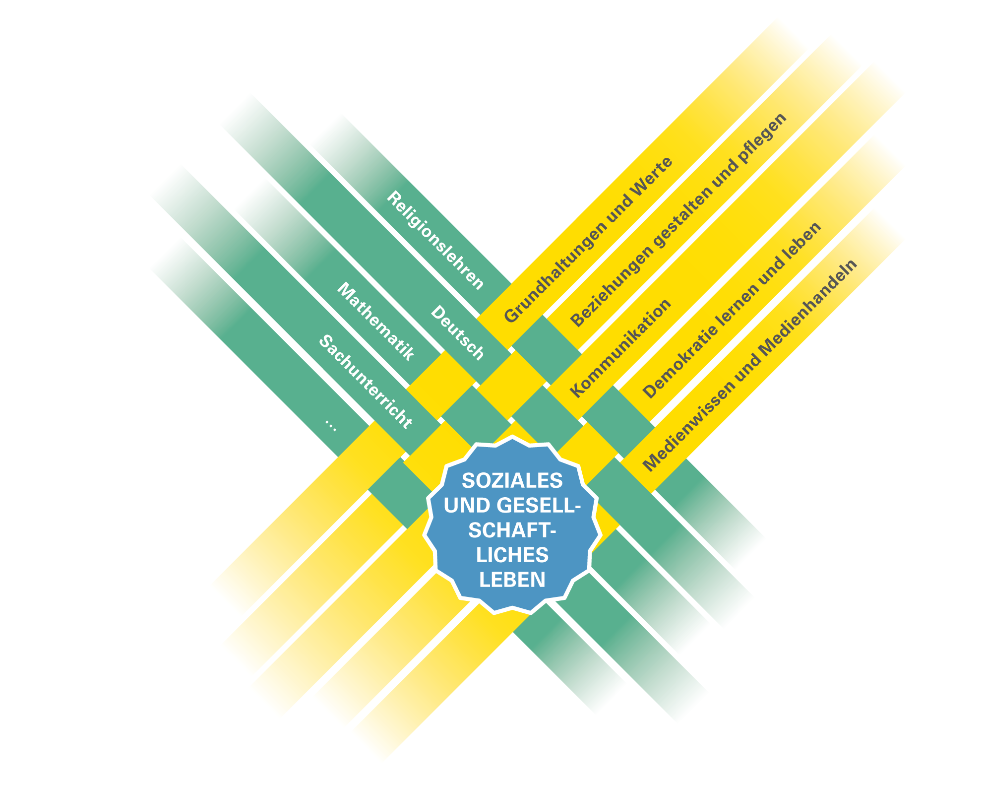 Die Schule ermöglicht den Schülerinnen und Schülern durchgängig alters- und entwicklungsangemessene Zugänge zu den unterschiedlichen Dimensionen des gesellschaftlichen Lebens, um sie auf ein gemeinschaftliches Zusammenleben und den Umgang mit anderen Menschen vorzubereiten. Schulische Übungsfelder und Hilfestellungen erlauben es den Schülerinnen und Schülern, neue Erfahrungen zu machen und ihre Verhaltensmuster, Routinen, Kenntnisse und Fertigkeiten zu ergänzen und zu erweitern. Die Lehrkräfte und weitere schulische Partner begleiten und ermutigen die Schülerinnen und Schüler in ihren Fragen, ihrer Auseinandersetzung mit Grundhaltungen und Werten, Normen und Weltanschauungen und damit in ihrer Suche nach ihrem Platz in der Gesellschaft.