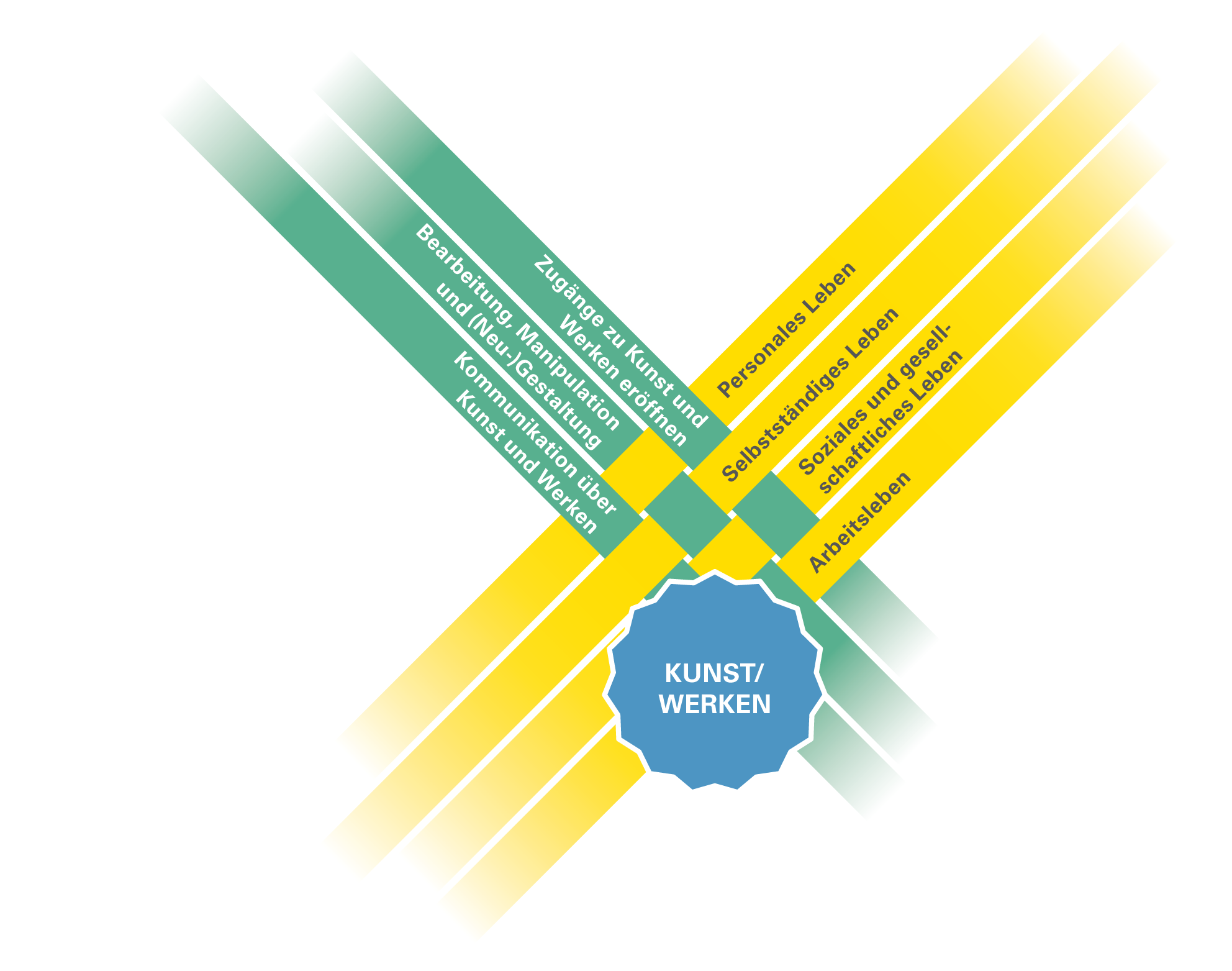 Das Fach Kunst/Werken steht damit in engem Bezug zum Lebensfeld Personales Leben, insbesondere zu den Unterbereichen Wahrnehmung der eigenen Person, Identität und Selbstbild sowie Selbstwirksamkeit und Selbstbestimmung, aber auch zum Lebensfeld Arbeitsleben, in dem grundlegende Erfahrungen im Umgang mit Werkzeugen und Techniken angelegt werden. Ebenso werden enge Zusammenhänge mit dem Lebensfeld Selbstständiges Leben gezogen, insbesondere mit dem Unterbereich Freizeit und Interessen. Außerdem bietet Kunst/Werken einen Beitrag zur persönlichen Entwicklung, indem individuelle Erfolgserlebnisse, Wirksamkeitserleben und Ausdruckmöglichkeiten ermöglicht werden.