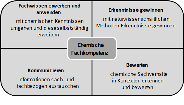 Die Bildungsstandards der KMK definieren bezüglich der chemischen Fachkompetenz vier Fachkompetenzbereiche, die – wie auch in den anderen Naturwissenschaften – in inhaltsbezogene Kompetenzen (Fachwissen) und prozessbezogene Kompetenzen (Erkenntnisse gewinnen, Kommunizieren und Bewerten) unterschieden werden können. Da sich Kompetenzen nur auf der Grundlage von Wissensinhalten entwickeln können, sind die prozessbezogenen Kompetenzen immer auf die inhaltsbezogene Kompetenz des Fachwissens gegründet: